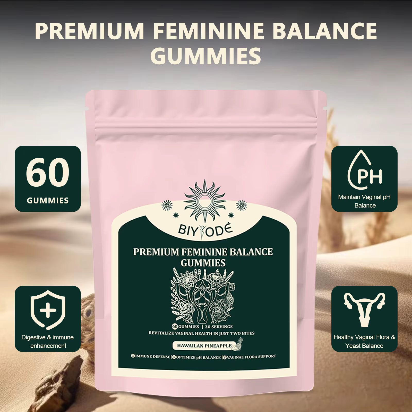 Infused with Hawaiian Pineapple for a tropical taste, these gummies work to support vaginal flora, optimize pH balance, and strengthen immune defense,  so you can glow from the inside out.